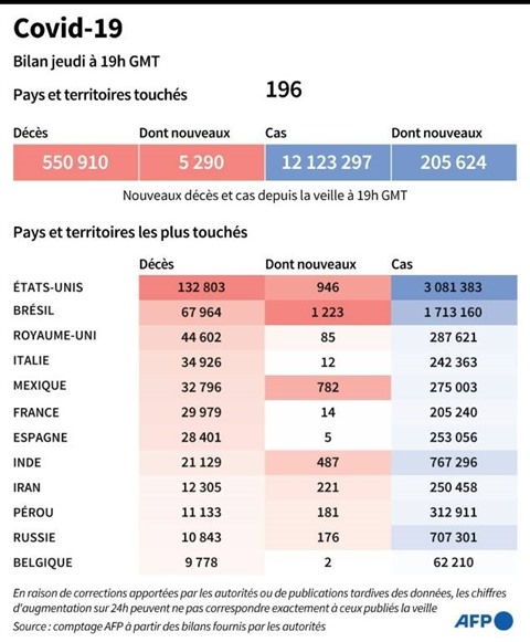 L'Organisation mondiale de la santé (OMS) a appelé jeudi 9 juillet à l'unité contre le virus, alors que le cap des 12 millions de cas déclarés venait d'être franchi dans le monde. Plus de 550.900 décès ont été recensés.