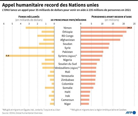 Les fonds demandés par l'ONU et ses partenaires visent à aider dans 56 pays quelque 160 millions de personnes (sur les 235 millions) parmi les plus vulnérables qui font face à la faim, aux conflits, aux déplacements et aux conséquences du changement climatique et de la pandémie.