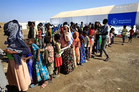 | Des Éthiopiens, qui ont fui les combats dans la région du Tigré, attendent une distribution de nourriture, le 27 novembre dans un camp de réfugiés à Hamdayti, au Soudan. |