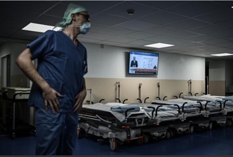 | Une télévision retransmet le discours du Premier ministre français, Jean Castex, dans un hôpital privé de Bruges (France), le 3 décembre. |