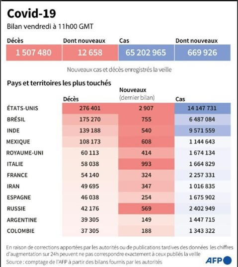 Le COVID-19 a fait à ce jour au moins 1.507.480 morts, pour 65,2 millions de cas, selon un comptage de l'AFP vendredi 4 décembre.