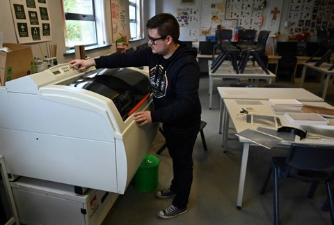 | Phil Jones, prof de techno et de design, utilise une vieille imprimante 3D pour fabriquer des équipements de protection, le 6 avril dans un lycée de Birkenhead, en Angleterre. |