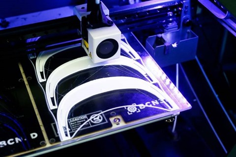 | Des imprimantes 3D de la société espagnole BCN3D fabriquent des pièces pour masques de protection, le 30 mars en Catalogne. |