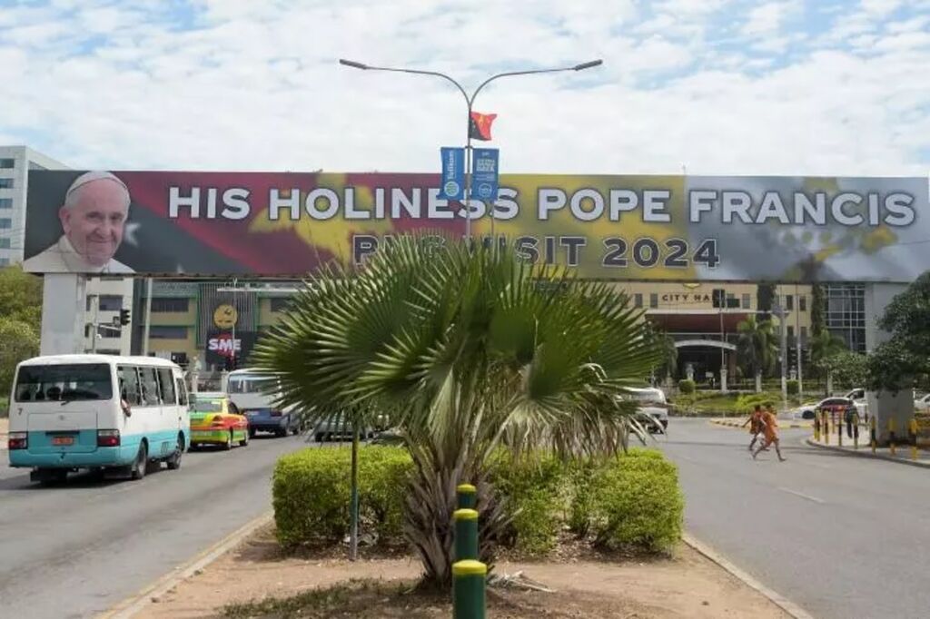 À Port Moresby, des rues auparavant poussiéreuses ont été balayées, les marchands ambulants ont été chassés et les drapeaux jaune et blanc du Saint-Siège sont suspendus aux lampadaires, où ils flottent sous la brise chaude de la mer de Corail.