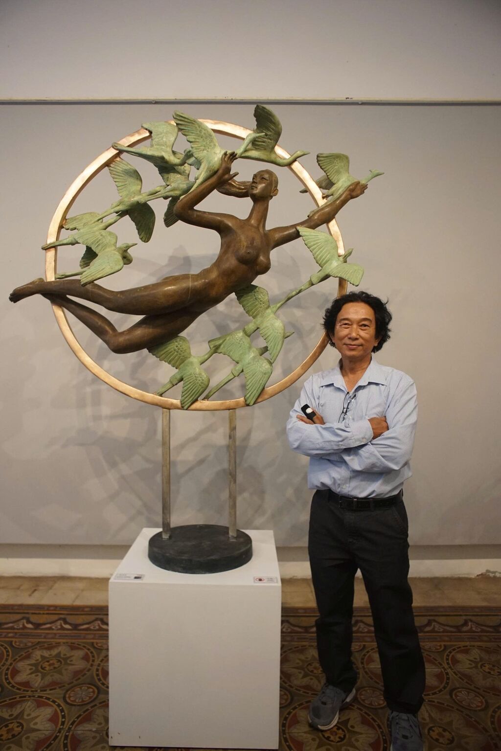 | Le sculpteur Nguyên Hoàng Ánh et une de ses oeuvres. |