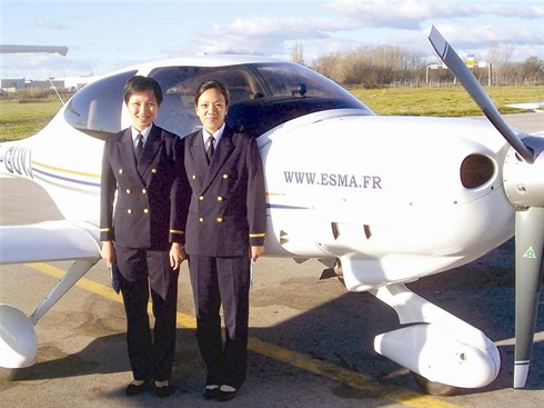 | Ly Huong (gauche) et sa camarade Nguyên Thi Thanh Thuy à côté de l’avion Diamond DA40. |
