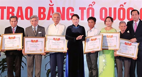 | La présidente de l’Assemblée nationale Nguyên Thi Kim Ngân (centre) lors de la cérémonie de remise des certificats "Reconnaissance nationale" aux proches des Héros morts pour la Patrie, le 18 juillet à Hanoï. |