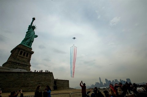 | Un avion de la Patrouille de France lâche les fumées bleu blanc rouge au-dessus de la Statue de la Liberté. |