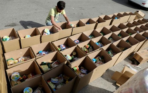 | Des volontaires remplissent des cartons de nourriture devant être distribués à des familles palestiniennes dans le besoin, le 19 avril à Naplouse, en Cisjordanie occupée. |