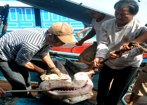 | Un requin capturé par les pêcheurs de la commune Nghia An, province de Quang Ngai (Centre). |