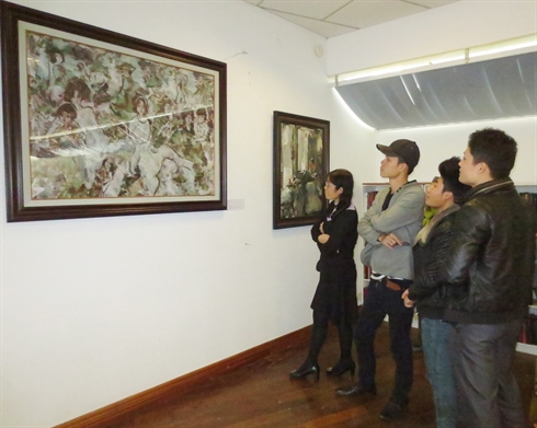 | Des visiteurs lors de la 3e exposition de la peinture vietnamienne à l'ambassade du Danemark, le 25 mars à Hanoi |