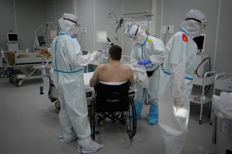 | Des soignants avec un patient atteint du COVID-19 dans l'unité de soins intensifs d'un hôpital temporaire à Moscou, le 9 novembre. |