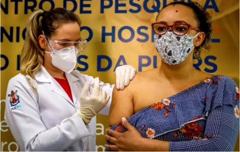 | Une volontaire (droite) reçoit le candidat vaccin du laboratoire chinois Sinovac Biotech, à Porto Alegre (Sud du Brésil), le 8 août. |