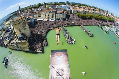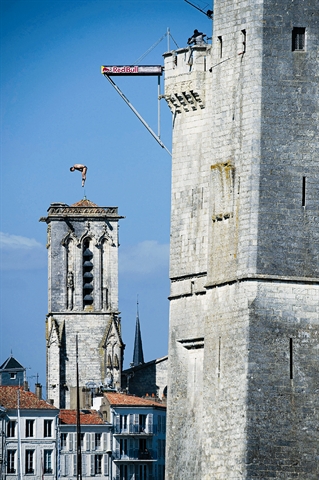 | Le Russe Artem Silchenko plonge depuis la plateforme de la tour Saint-Nicolas à La Rochelle. |