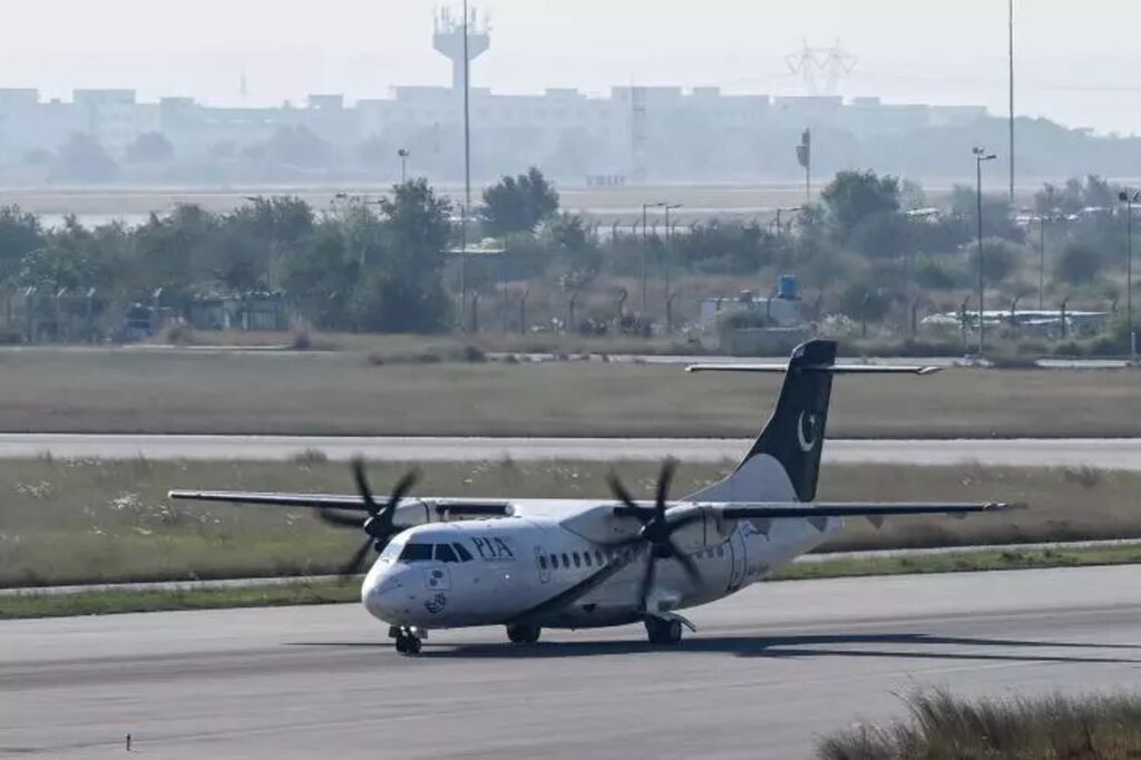| Un avion ATR de la compagnie publique aérienne pakistanaise Pakistan International Airlines (PIA) en train d'atterrir à l'aéroport international d'Islamabad le 31 octobre. |