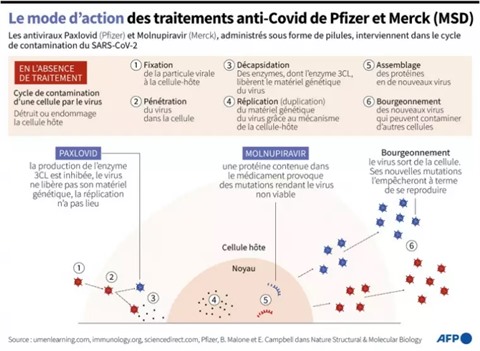 | Description des effets des traitements contre le COVID-19 de Pfizer et Merck (MSD) sur le cycle de contamination du SARS-CoV-2. |