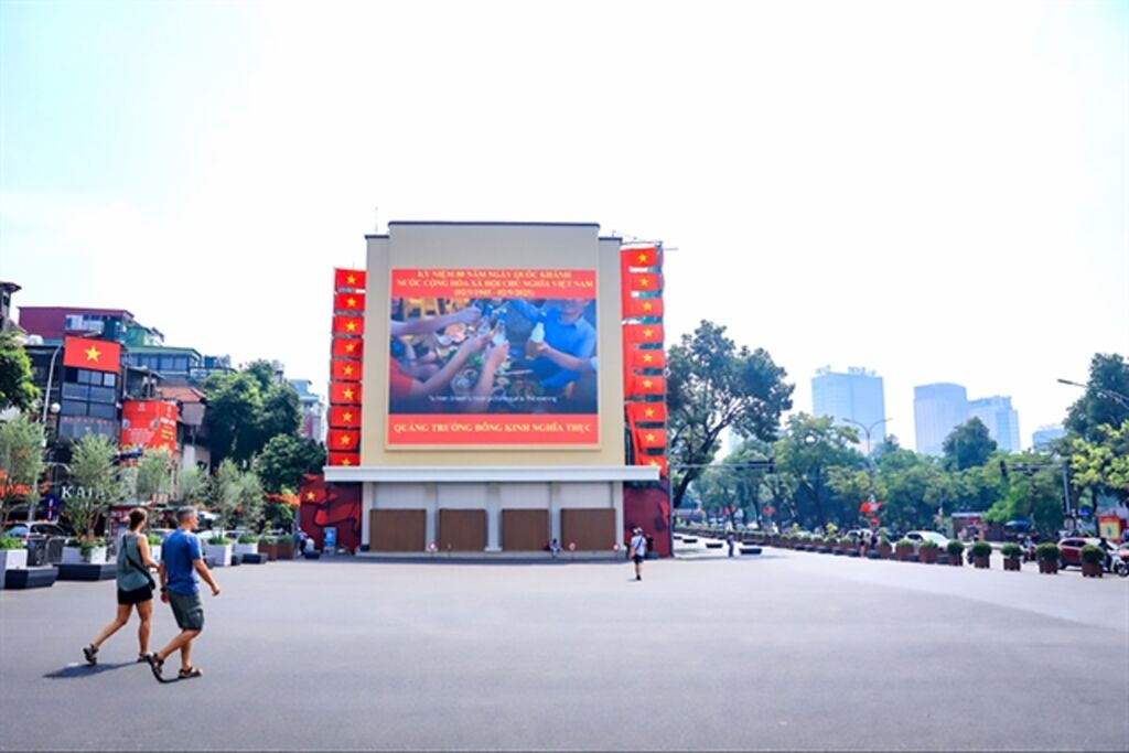 Les autorités municipales ont installé un grand écran LED sur la façade du n°7-9 de la rue Dinh Tiên Hoàng, ancien emplacement du bâtiment "Mâchoire de requin". Un côté du bâtiment est orné des centaines de drapeaux nationaux, commémorant la 80e Fête nationale (du 2 septembre 1945-2025).