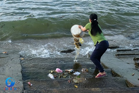 | Une femme vietnamienne décharge des ordures dans la rivière. |