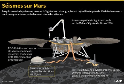 | Présentation de la sonde InSight de la NASA qui s'est posée sur Mars en novembre 2018 et qui a détecté près de 500 frémissements dont une quarantaine probablement dus à des séismes. |