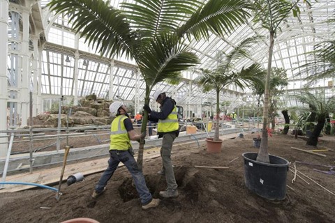 | Deux hommes plantent un arbre dans la serre "Temperate House", située dans les jardins botaniques des Kew Gardens, à l'ouest de Londres, le 13 février. |