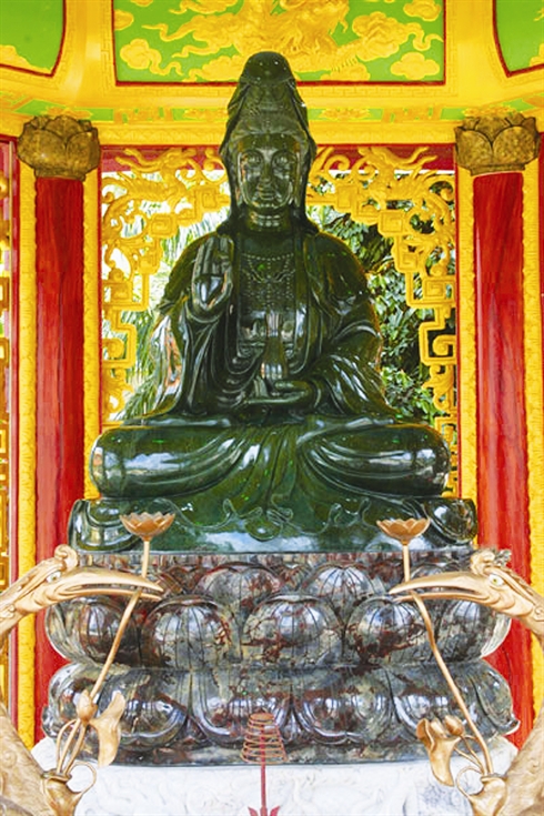 «La Kwan Yin (Bodhisattva de la Miséricorde, selon le terme du bouddhisme ; autrement dit disciple de la Miséricorde) en jade a été inaugurée ici, dans le secteur cultuel de Nam Minh, dans le village de Vinh Hiêp, province méridionale de Dông Nai. Une équipe de sculpteurs locaux a travaillé dessus pendant un an», indique avec fierté Trinh Huu Hoà, 64 ans, propriétaire du chef d’œuvre. D’une hauteur de 4,3 m (piédestal inclus) et pesant 8 tonnes, la statue trône orgueilleusement dans un temple hexagonal érigé au centre du secteur cultuel de Nam Minh.