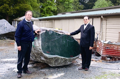 | Trinh Huu Hòa (droite) et Kirk Makepeace à côté du bloc massif de jade de 11,5 tonnes provenant du Canada qui a servi à tailler la statue. |