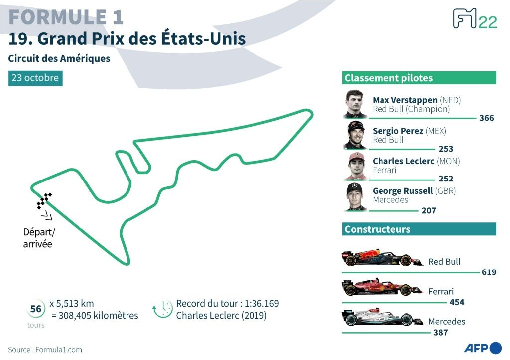 Lewis Hamilton (Mercedes), septuple champion du monde, s'élancera de la 3e position. Le Britannique, qui aimerait décrocher une première victoire en 2022, pour l'honneur, sur le circuit des Amériques où il s'est déjà imposé quatre fois entre 2014 et 2017, a lui aussi profité d'un déclassement.