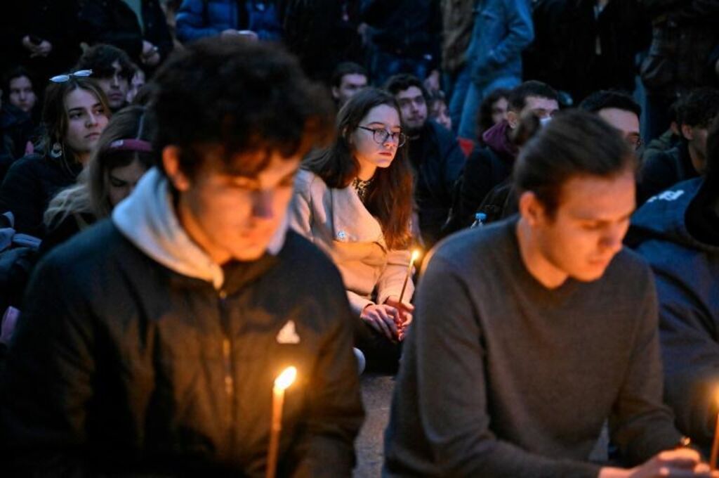 | Des étudiants participent à une veillée à la mémoire des victimes de la collision entre deux trains près de Larissa, le 28 février en Grèce. |