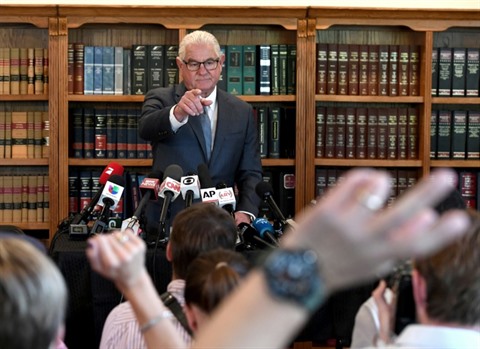 | Leslie Mark Stovall, avocat de Kathryn Mayorga, lors d'une conférence de presse à Las Vegas le 3 octobre 2018. |