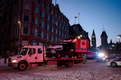 | Enlèvement d'un des nombreux camions bloquant les rues d'Ottawa depuis trois semaines, le 19 février. |