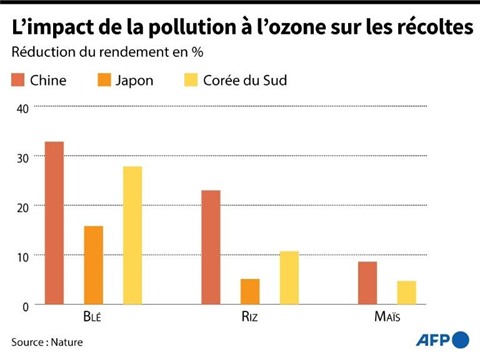 Ils ont ensuite construit un modèle en utilisant les données de qualité de l'air de plus de 3.000 stations de mesures en Chine, en Corée du Sud et au Japon. Selon leurs résultats, environ 33% des récoltes de blé en Chine sont perdues chaque année à cause de la pollution à l'ozone, 28% en Corée du Sud et 16% au Japon.