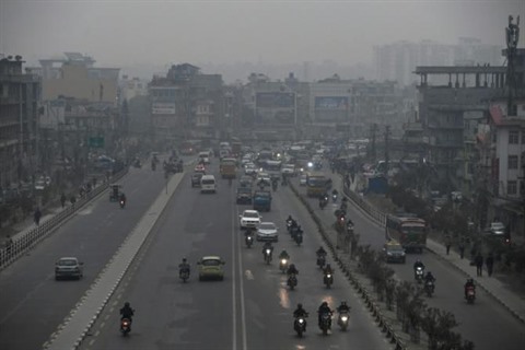 | Les habitants de la capitale népalaise circulent dans un épais nuage de pollution à Katmandou, le 29 mars. |