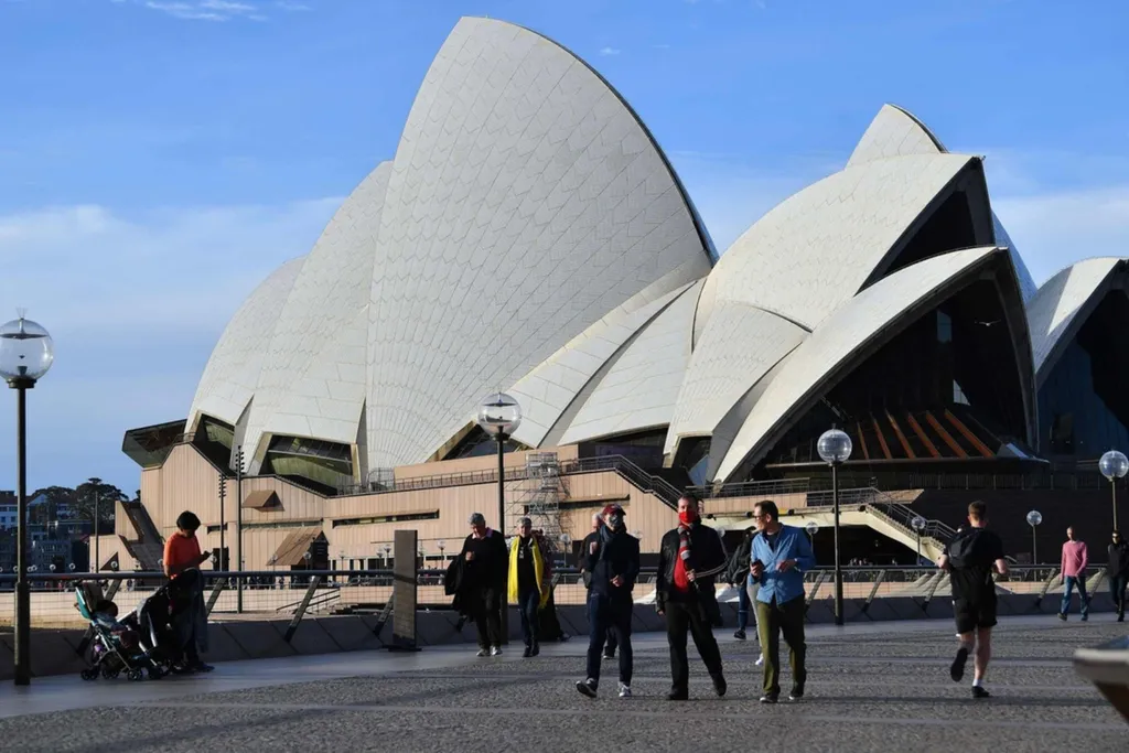 | Visiteurs devant l'Opéra de Sydney, en Australie. |