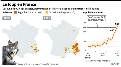 Le plan loup adopté en 2018, dénoncé par les éleveurs et les défenseurs de l'environnement, prévoyait que le "seuil de viabilité démographique" fixé à 500, qui représente l'aptitude d'une population à moyen terme (100 ans) "à résister au risque d'extinction", ne serait atteint qu'en 2023.
