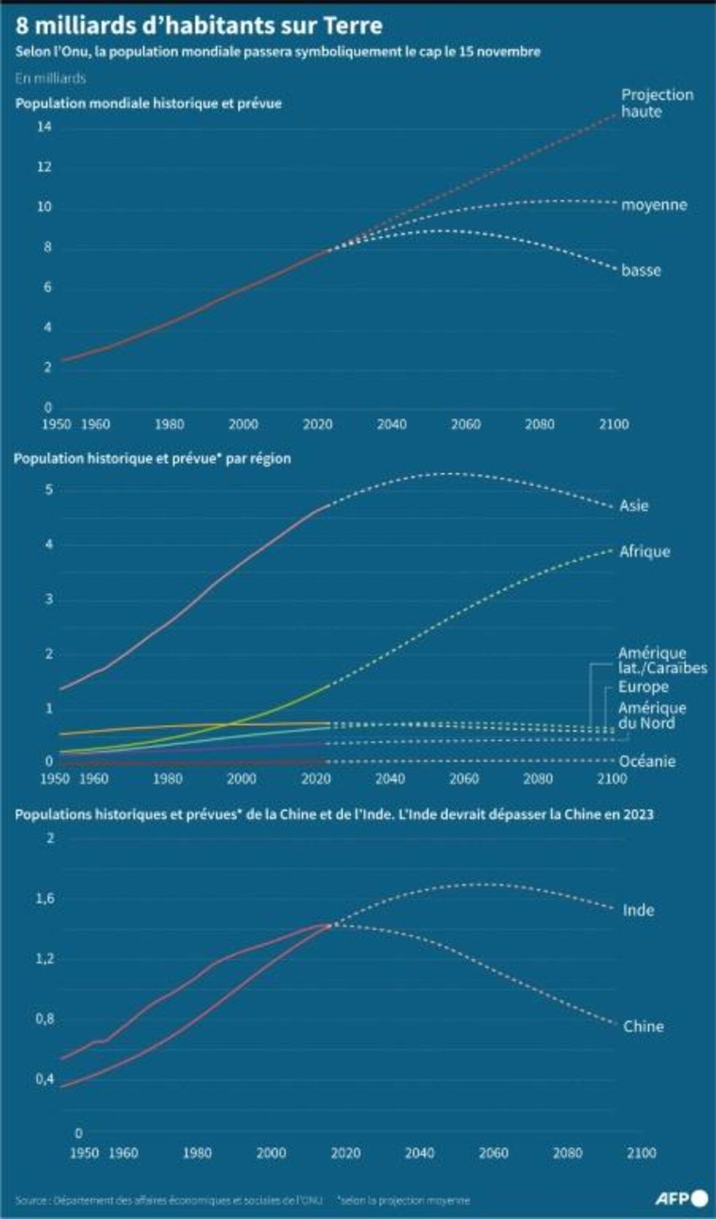Alors que la Terre a compté moins d'un milliard d'habitants jusque dans les années 1800, elle n'a mis que douze ans pour passer de 7 à 8 milliards. Signe de son ralentissement démographique, il lui faudra environ quinze ans pour atteindre les 9 milliards en 2037. L'ONU projette un "pic" à 10,4 milliards dans les années 2080 et une stagnation jusqu'à la fin du siècle.