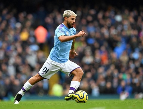 | L'attaquant de Manchester City, Sergio Agüero, lors du match de Premier League face à Aston Villa, à Manchester. |