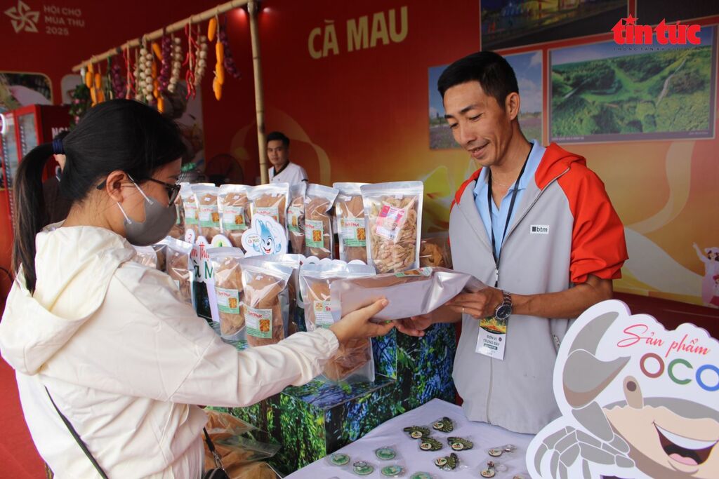 Le stand de Cà Mau apporte les saveurs uniques de cette terre située à l’extrême Sud du pays. "Au stand de Cà Mau, nous préparons et servons de nombreuses spécialités célèbres telles que du crabe grillé au sel et aux herbes et du pâté de crevettes, deux plats emblématiques de notre région du Sud. En outre, nous proposons aussi des crevettes séchées, des chips de crevettes et d’autres produits de la mer typiques. L’affluence est très importante, si bien que chaque jour, les crabes doivent ‘prendre l’avion’ de Cà Mau à Hanoï pour garantir leur fraîcheur et préserver le goût authentique de Cà Mau. À travers cette foire, nous souhaitons faire connaître la cuisine et les spécialités locales de Cà Mau aux habitants de la capitale et des provinces voisines. C’est aussi une belle occasion d’inviter tout le monde à se rendre à Cà Mau à l’occasion de la 2ᵉ Fête du crabe, prévue du 16 au 22 novembre 2025", confie Dinh Dang Duy, représentant du stand de Cà Mau.