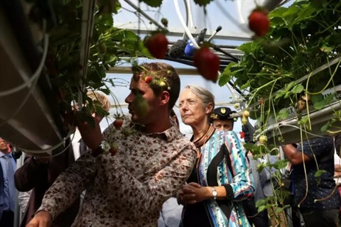 | Elisabeth Borne (droite) visite une serre de fraises, le 26 mai à Sandillon, dans le Loiret. |