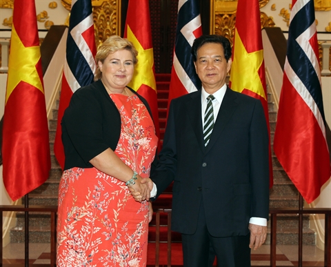 | La Première ministre norvégienne Erna Solberg et son homologue vietnamien Nguyên Tân Dung, le 16 avril à Hanoi. |
