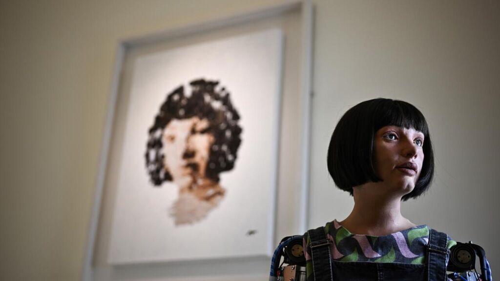 Ce robot-artiste, qui utilise l'IA pour créer des tableaux ou des sculptures, dispose de caméras dans ses yeux et ses mains bioniques. Il se déplace et s'exprime de manière autonome, sans intervention humaine.