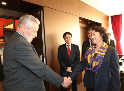 | La présidente de l'Assemblée nationale, Nguyên Thi Kim Ngân, et le président de l'Association d'amitié Hongrie-Vietnam, Botsz Laszlo, le 10 avril en Hongrie. |