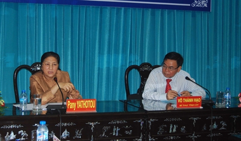 | La présidente de l'Assemblée nationale lao, Pany Yathotou, lors d'une séance de travail le 1er avril avec les autorités provinciales de Bên Tre (Sud). |