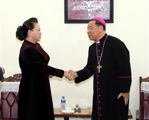 | La présidente de l'Assemblée nationale du Vietnam, Nguyên Thi Kim Ngân, et l'archevêque Mgr Joseph Vu Van Thiên le 20 décembre à Hanoï. |