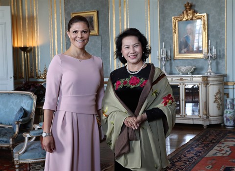 | La présidente de l'AN du Vietnam Nguyên Thi Kim Ngân (droite) et la princesse héritière de Suède, Victoria Alice Désirée, le 7 avril |