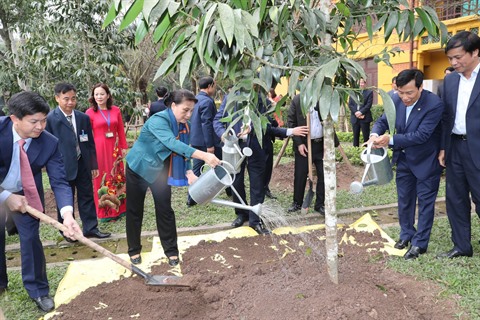 | La présidente de l'AN, Nguyên Thi Kim Ngân (1er rang, 2e à gauche), plante un arbre dans la zone commémorative du Président Hô Chi Minh. |