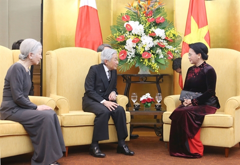 | La présidente de l'Assemblée nationale du Vietnam, Nguyên Thi Kim Ngân (droite), reçoit l’empereur Akihito et l’impératrice Michiko du Japon, le 1er mars. |