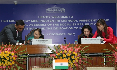 | La présidente de l'AN vietnamienne Nguyên Thi Kim Ngân (droite) et la présidente de la Chambre basse du Parlement indien Sumitra Mahajan ont signé, le 9 décembre à New Delhi, une convention de coopération entre les deux organes législatifs |