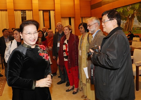 | La présidente de l’Assemblée nationale, Nguyên Thi Kim Ngân, et des délégués participant à la conférence du Comité exécutif du Conseil mondial de la paix. |