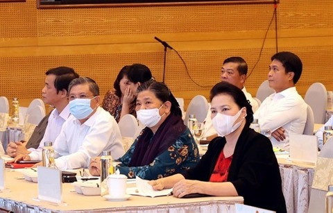 | La présidente de l’AN vietnamienne, Nguyên Thi Kim Ngân (1re à droite) et la vice-présidente permanente de l’AN vientamienne Tong Thi Phong (2e à droite) lors de l’événement. |