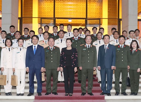 | La présidente de l’Assemblée nationale Nguyễn Thị Kim Ngân (1er plan, centre) reçoit 20 jeunes policiers exemplaires en 2016, le 24 mars à Hanoï. |